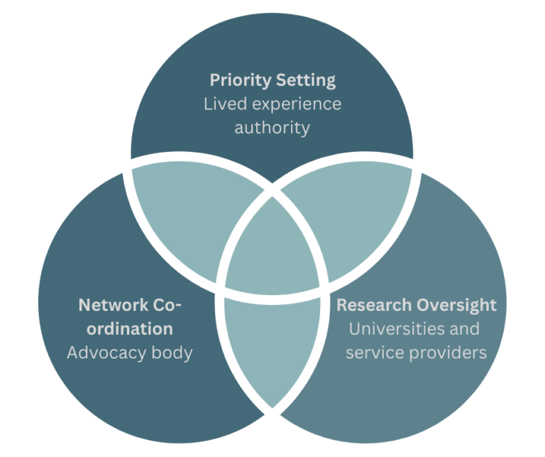 Priority setting: A lived experience authority will be established within a lived experience organisation. This authority will be a cornerstone of the governance structure and oversee co-design of research priorities and co-production of the research and its translation.