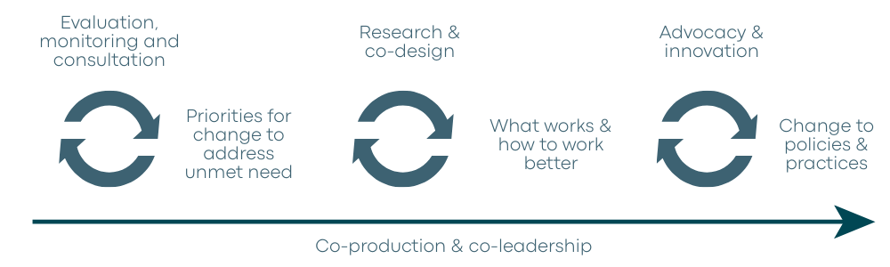 A sustainable partnership is needed between service providers, policymakers, and researchers for the efficient conduct of research and its translation into real world impact. By embedding lived experience leadership into this place-based approach, and involving local universities and research institutes as collaborators from the outset, innovation and reform can be evidence-based and driven by the community it’s intended to benefit.
